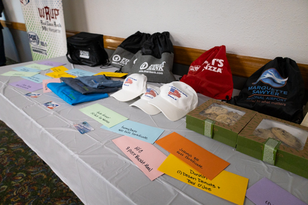 Tadychs Marketplace Foods gift basket, Texas Roadhouse Marquette $100 gift card, and SuperOne Foods $75 Gift Card as well as Jet’s Pizza, Crossroads Restaurant & Lounge, First Bank Marquette, Quality Car Care Center of Marquette, Ojibwa Casinos Marquette, and Dunkin’.